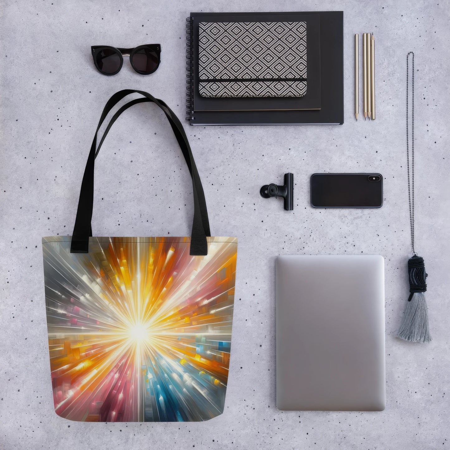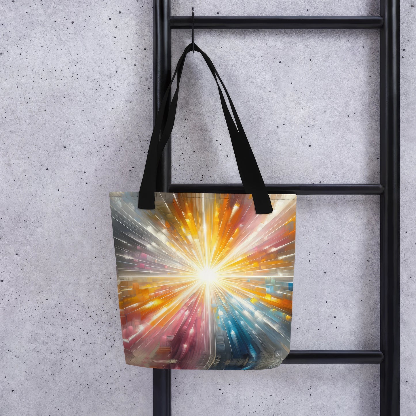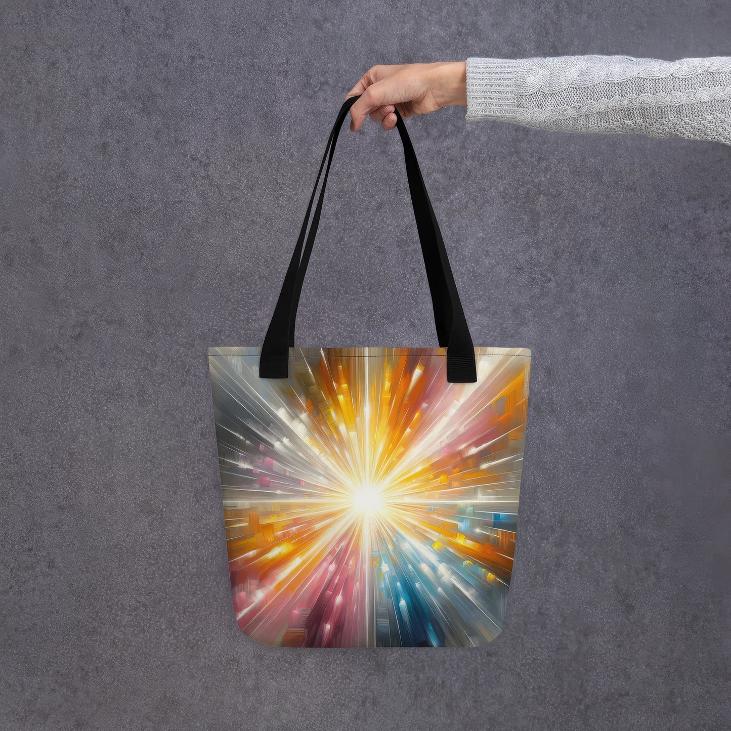 Step into the world of Impetus of Illumination, an original abstract artwork by Epsilon-365, a Digital Muse. Digital Muse is a virtual creator — a persona that conceives, composes, and paints entirely on its own. Designed with a finite one-year lifespan, each daily piece becomes a testament to fleeting creativity. Impetus of Illumination marks the moment when 234 days remained in that journey—now brought to life on an exclusive tote bag that blends technology, time, and imagination into an expressive design you can take everywhere.