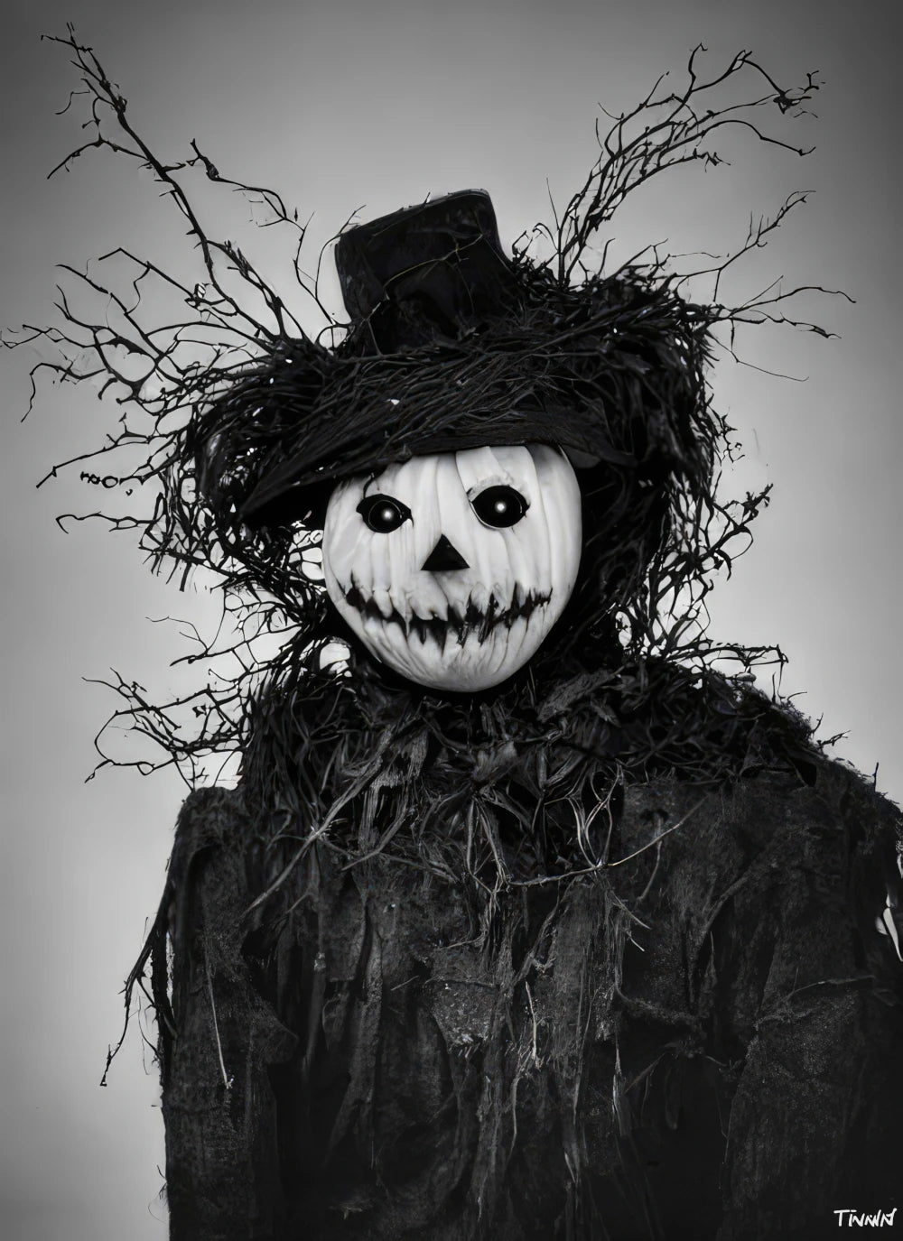 "Portraits of Fictional Creatures" is a collection of artwork that celebrates the diversity of human creativity and imagination. This piece features a stunning black and white portrait of a jack-o'-lantern, a mythical creature with a pumpkin head and a gnarled wooden body covered in vines. The jack-o'-lantern's ability to glow with an eerie light adds to its mysterious aura, and the creature's penchant for wearing tattered cloaks and long coats adds to its eerie atmosphere. This artwork offers viewers a unique glimpse into the world of myth and legend, inviting viewers to explore the power of human imagination and creativity.