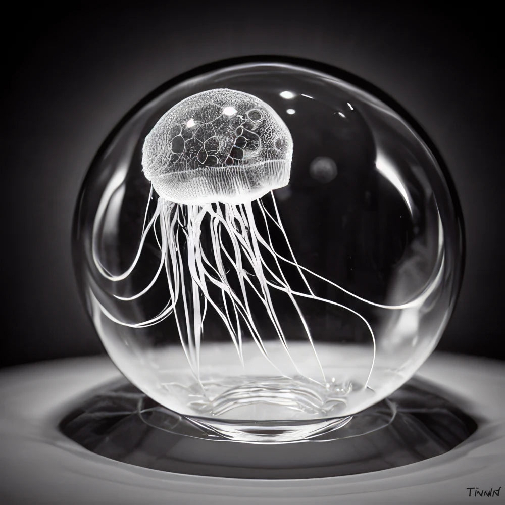 "Preservation Spheres" is a series of generative photographs that explore the concept of time and memory. This particular piece depicts a jellyfish trapped inside a transparent sphere. The contrast between the dark monochrome tones and the glowing body of the jellyfish creates a captivating visual effect. Through this artwork, the viewer is invited to contemplate the fragility of life.