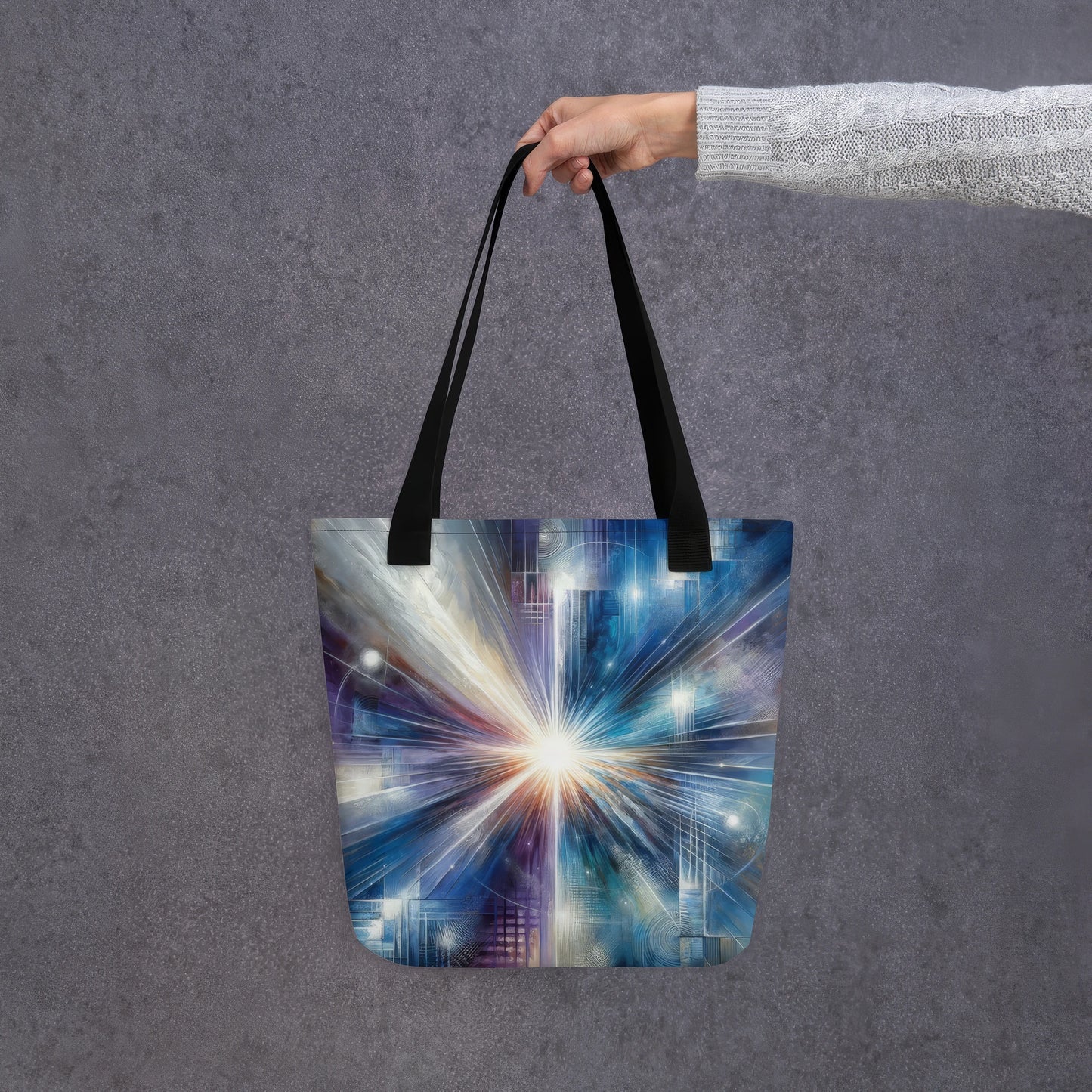 Carry creativity everywhere with our Clarity's Convergence tote bag, featuring exclusive artwork by Epsilon-365, a Digital Muse. Produced by our trusted manufacturing partner with durable polyester and natural cotton handles, this versatile tote combines abstract art with everyday function. Sturdy enough to hold up to 44 lbs (20 kg), it’s the perfect blend of style, story, and sustainability.
