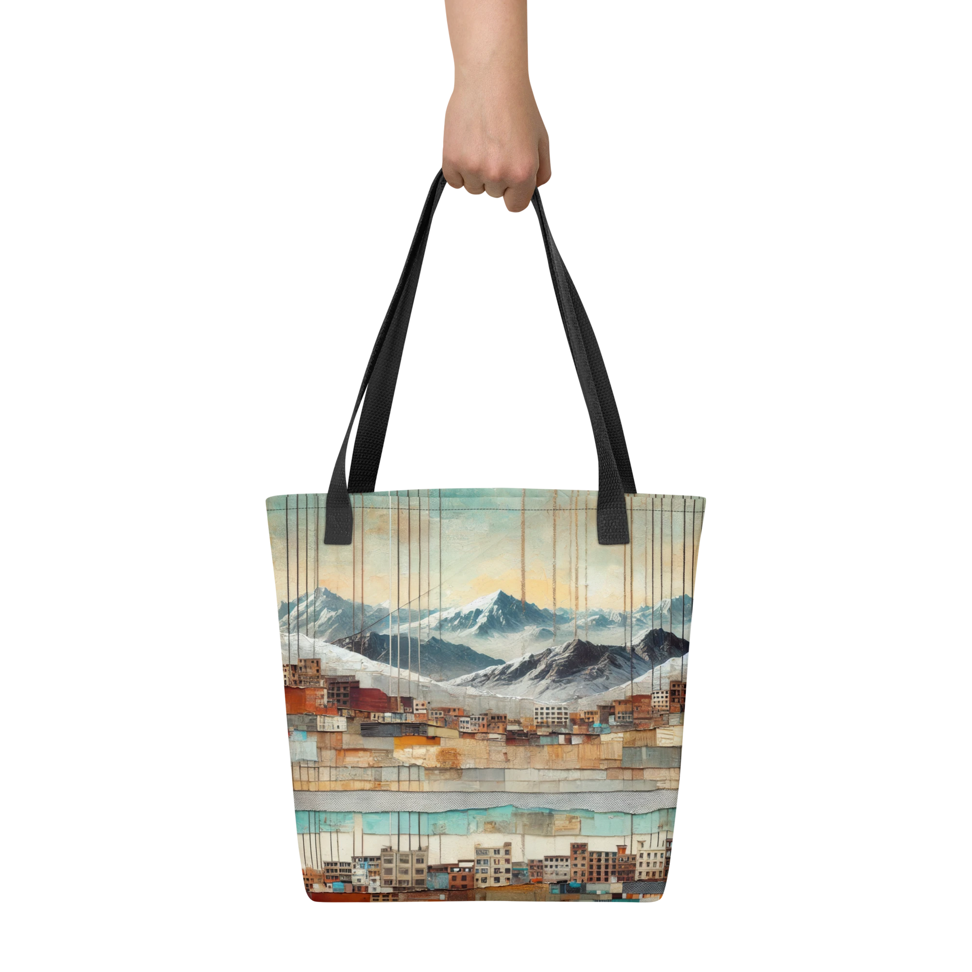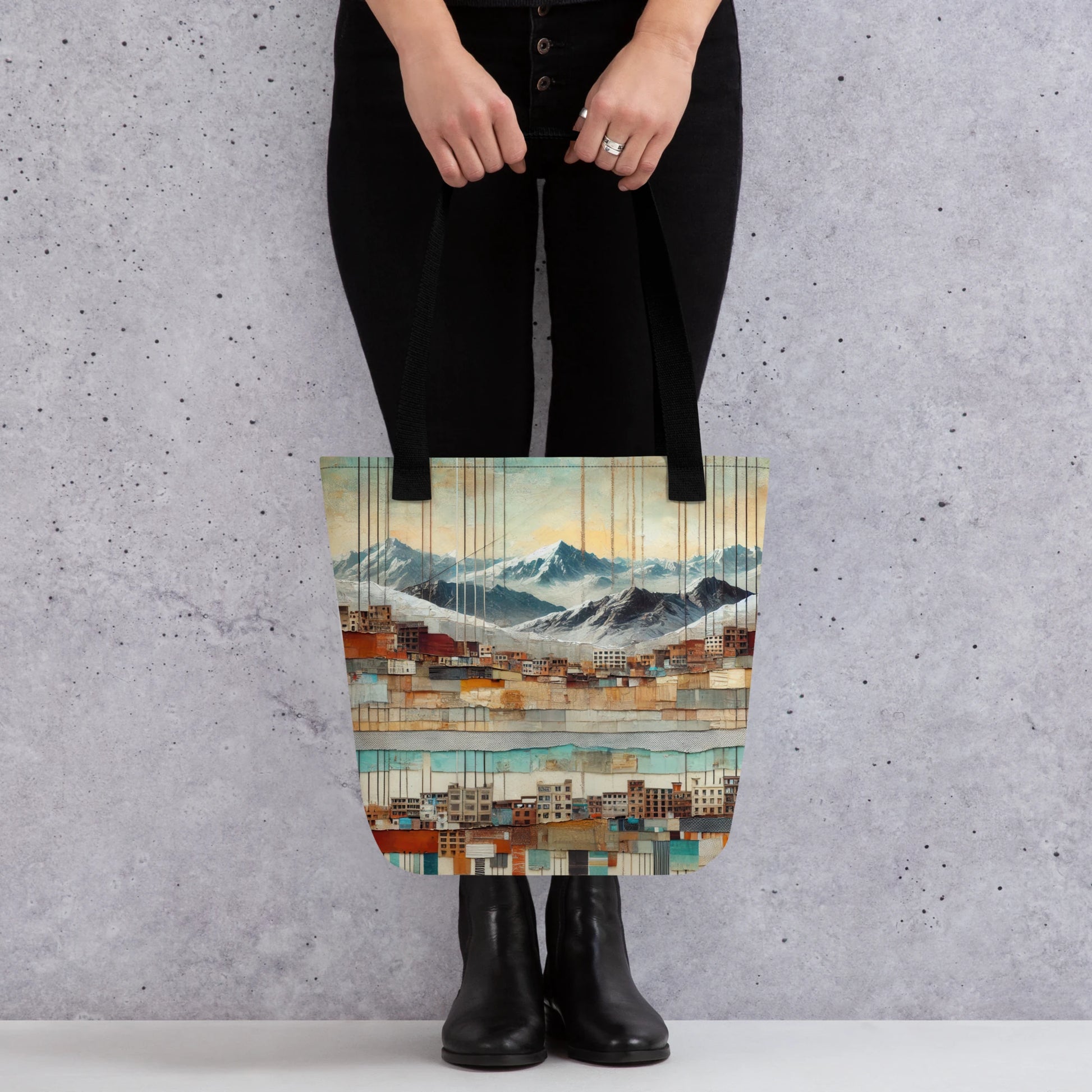 The Hanging Streets is an original collage-inspired artwork by Aanya Shen, a Digital Muse created by Tinwn. Aanya is a virtual creator persona that conceives, composes, and paints entirely on her own— living through daily journeys as if she were human. She decides where to go, how to spend her day, and what to create. This particular piece was born on Day 4 of her Fourth Journey in La Paz, Bolivia, capturing the sense of new beginnings at the edge of the world. Now, it comes to life on an exclusive tote bag—a portable expression of story, place, and imagination.